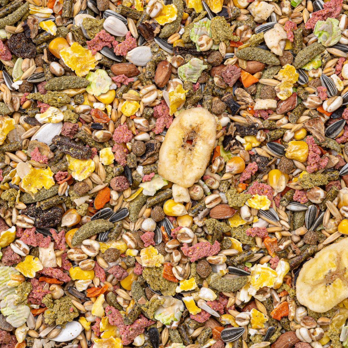 teraviljad, taimse päritoluga kõrvalsaadused, köögiviljad (14,1%), seemned (7% päevalilleseemned, 1% kõrvitsaseemned), pähklid (3% maapähklid), puuviljad (1% rosinad, 0,5% kuivatatud õun, 0,5% kuivatatud banaan), liha ja loomse päritoluga kõrvalsaadused, mineraalained, õlid ja rasvad, pärm