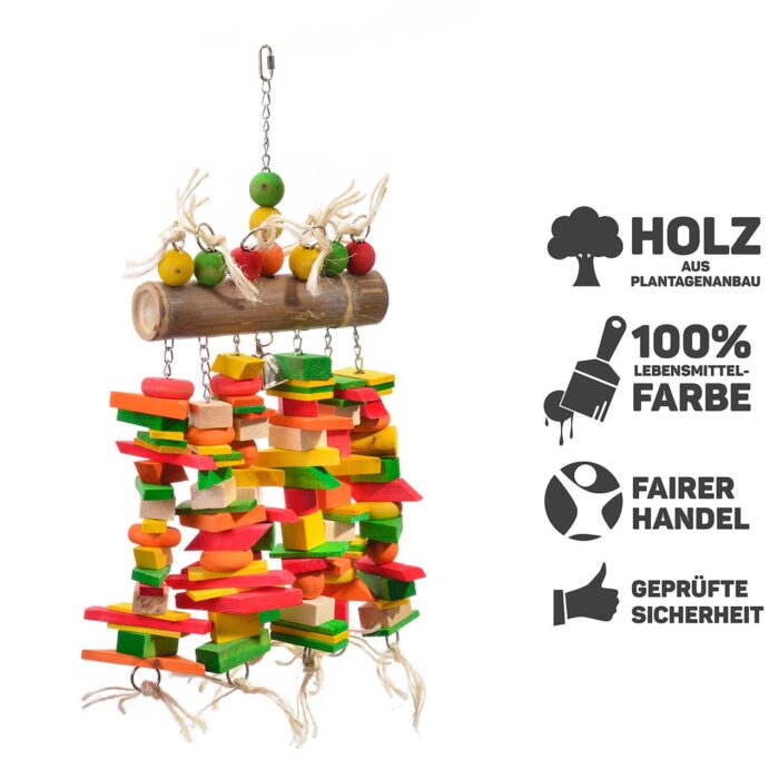 Mänguasi rikastab puuri ja pakub mitmekesist närimistegevust pikaks ajaks. Mänguasi on nii suur, et selle peal saab lausa ronida ja kiikuda. Närimismänguasjad soodustavad papagoi loovust ja stimuleerivad ajutööd. Närimine hoiab papagoi nokka töös ja igavust eemal.